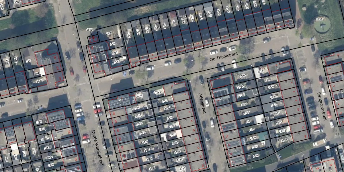 Oe Thantstraat 4 is gelegen op kadastraal perceel DEL00S2792. Deze kadastrale aanduiding is uniek en wordt gebruikt door het Kadaster om eigendomsrechten en andere zakelijke rechten vast te leggen. Het perceel maakt onderdeel uit van de kadastrale gemeente Delft.