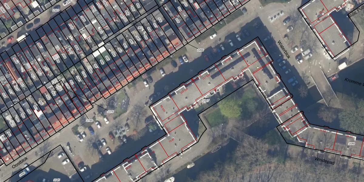 Oostblok 105 is gelegen op kadastraal perceel DEL00P1647. Deze kadastrale aanduiding is uniek en wordt gebruikt door het Kadaster om eigendomsrechten en andere zakelijke rechten vast te leggen. Het perceel maakt onderdeel uit van de kadastrale gemeente Delft.