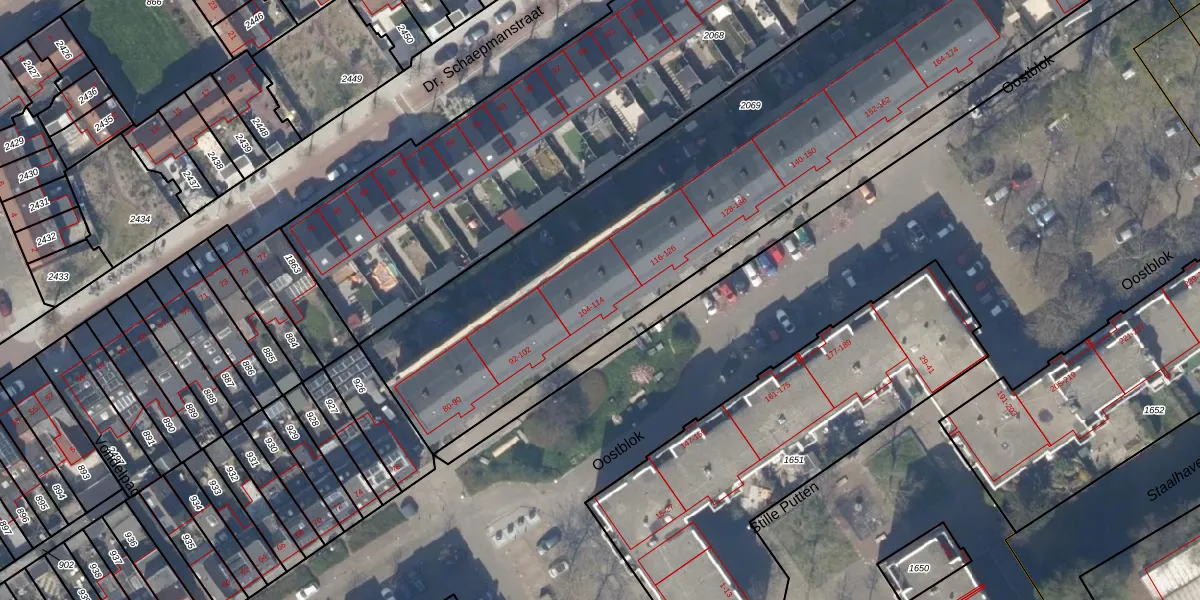 Oostblok 106 is gelegen op kadastraal perceel DEL00P2069. Deze kadastrale aanduiding is uniek en wordt gebruikt door het Kadaster om eigendomsrechten en andere zakelijke rechten vast te leggen. Het perceel maakt onderdeel uit van de kadastrale gemeente Delft.