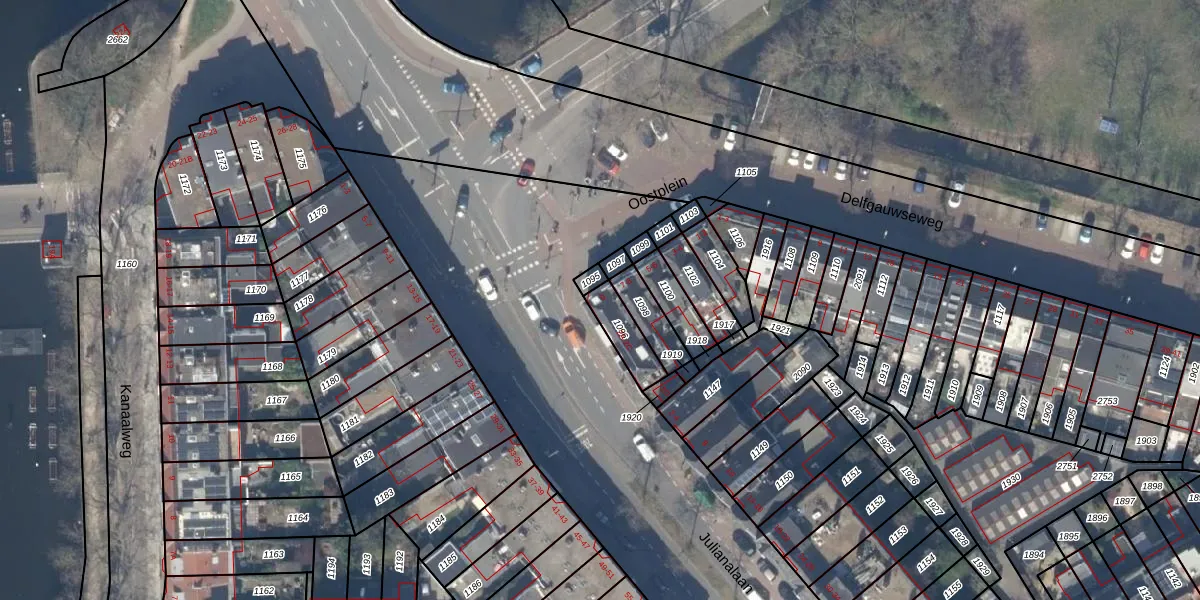 Oostplein 9 is gelegen op kadastraal perceel DEL00P1096. Deze kadastrale aanduiding is uniek en wordt gebruikt door het Kadaster om eigendomsrechten en andere zakelijke rechten vast te leggen. Het perceel maakt onderdeel uit van de kadastrale gemeente Delft.
