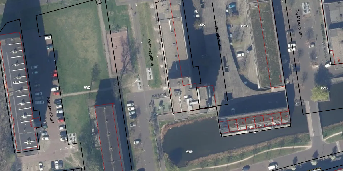 Het perceel waarop Palmyraplaats 88 staat heeft een oppervlakte van 4845 m². Dit is een zeer groot perceel. De perceeloppervlakte wordt geregistreerd door het Kadaster. Gedetailleerde informatie over de maten van dit perceel kunt u vinden in het rapport Kadastrale kaart met maatvoering van Palmyraplaats 88.