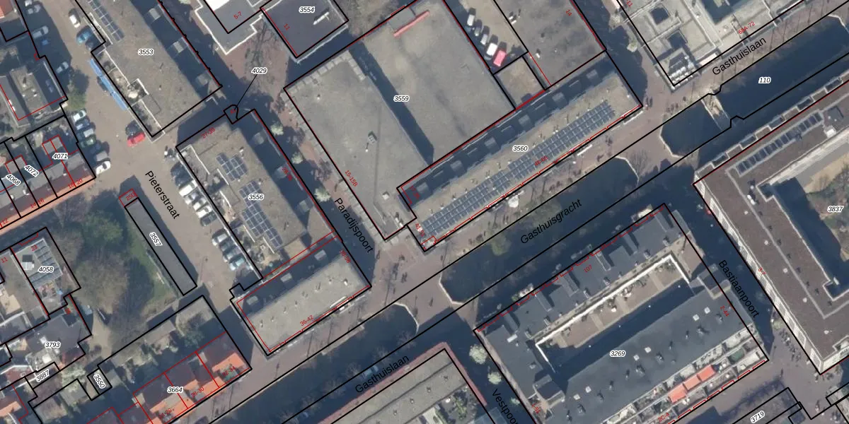 Het perceel waarop Paradijspoort 19 staat heeft een oppervlakte van 1047 m². Dit is een zeer groot perceel. De perceeloppervlakte wordt geregistreerd door het Kadaster. Gedetailleerde informatie over de maten van dit perceel kunt u vinden in het rapport Kadastrale kaart met maatvoering van Paradijspoort 19.