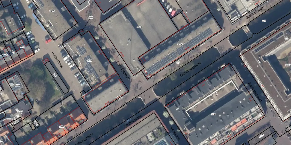 Het perceel waarop Paradijspoort 43 staat heeft een oppervlakte van 1047 m². Dit is een zeer groot perceel. De perceeloppervlakte wordt geregistreerd door het Kadaster. Gedetailleerde informatie over de maten van dit perceel kunt u vinden in het rapport Kadastrale kaart met maatvoering van Paradijspoort 43.