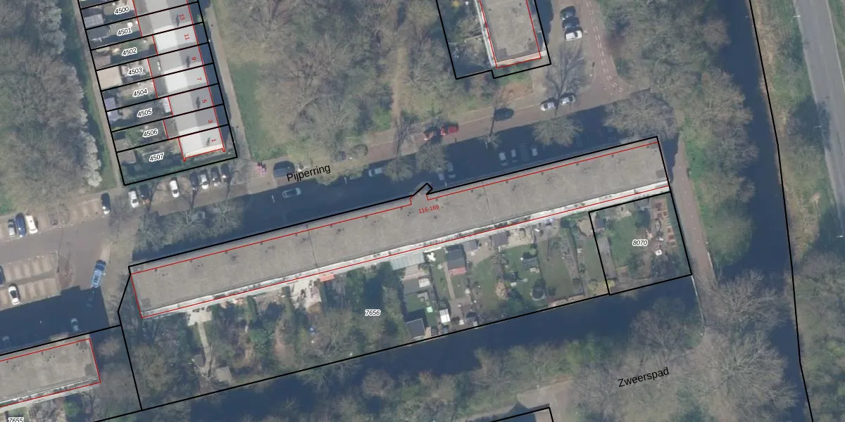 Het perceel waarop Pijperring 132 staat heeft een oppervlakte van 4095 m². Dit is een zeer groot perceel. De perceeloppervlakte wordt geregistreerd door het Kadaster. Gedetailleerde informatie over de maten van dit perceel kunt u vinden in het rapport Kadastrale kaart met maatvoering van Pijperring 132.