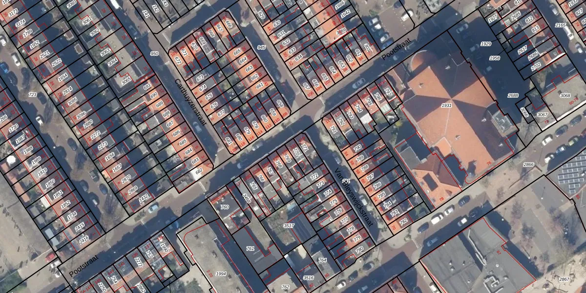 Het perceel waarop Pootstraat 121 staat heeft een oppervlakte van 46 m². Dit is een klein perceel. De perceeloppervlakte wordt geregistreerd door het Kadaster. Gedetailleerde informatie over de maten van dit perceel kunt u vinden in het rapport Kadastrale kaart met maatvoering van Pootstraat 121.