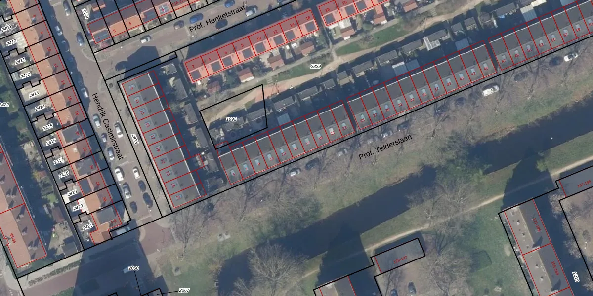 Prof. Telderslaan 15 is gelegen op kadastraal perceel DEL00K2829. Deze kadastrale aanduiding is uniek en wordt gebruikt door het Kadaster om eigendomsrechten en andere zakelijke rechten vast te leggen. Het perceel maakt onderdeel uit van de kadastrale gemeente Delft.
