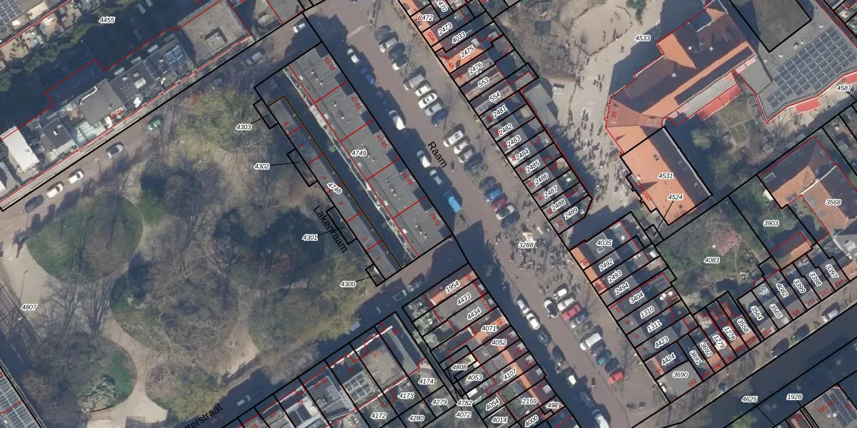 Het perceel waarop Raam 33 staat heeft een oppervlakte van 813 m². Dit is een groot perceel. De perceeloppervlakte wordt geregistreerd door het Kadaster. Gedetailleerde informatie over de maten van dit perceel kunt u vinden in het rapport Kadastrale kaart met maatvoering van Raam 33.