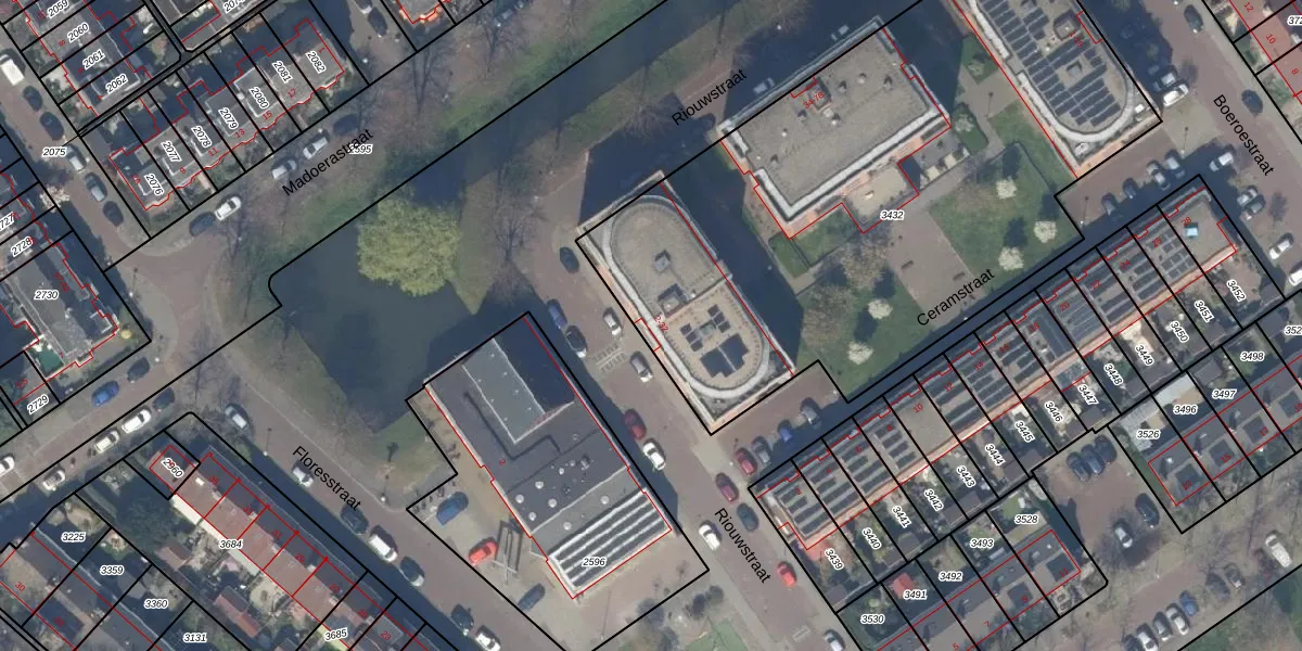 Het perceel waarop Riouwstraat 30 staat heeft een oppervlakte van 3424 m². Dit is een zeer groot perceel. De perceeloppervlakte wordt geregistreerd door het Kadaster. Gedetailleerde informatie over de maten van dit perceel kunt u vinden in het rapport Kadastrale kaart met maatvoering van Riouwstraat 30.
