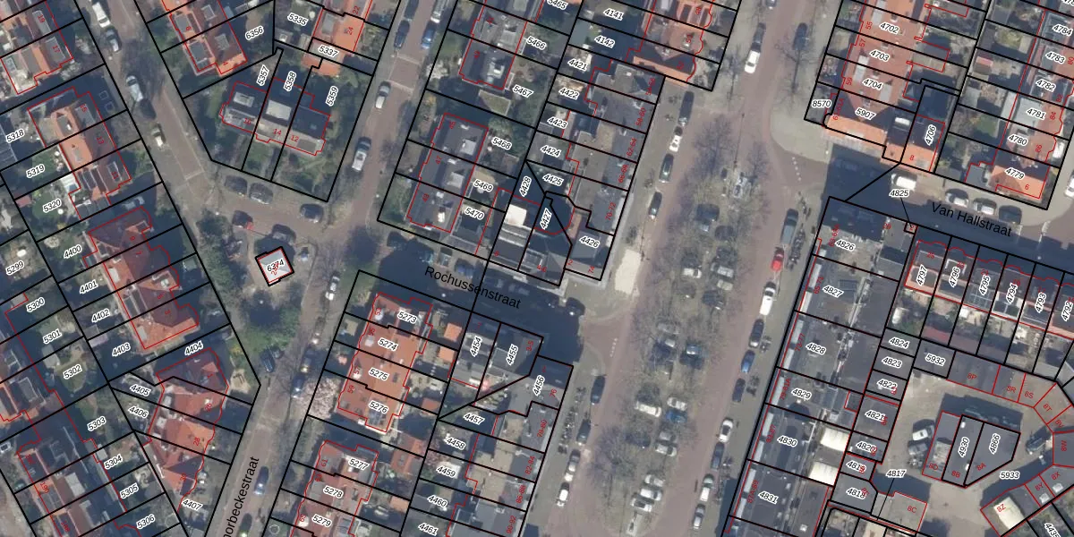 Het perceel waarop Rochussenstraat 6 staat heeft een oppervlakte van 91 m². Dit is een klein perceel. De perceeloppervlakte wordt geregistreerd door het Kadaster. Gedetailleerde informatie over de maten van dit perceel kunt u vinden in het rapport Kadastrale kaart met maatvoering van Rochussenstraat 6.