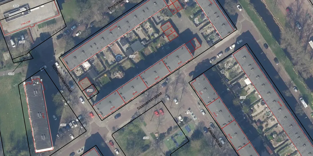 Saaiwerkerstraat 28 is gelegen op kadastraal perceel DEL00O1500. Deze kadastrale aanduiding is uniek en wordt gebruikt door het Kadaster om eigendomsrechten en andere zakelijke rechten vast te leggen. Het perceel maakt onderdeel uit van de kadastrale gemeente Delft.