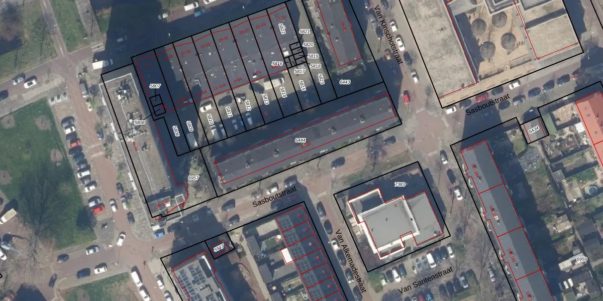 Sasboutstraat 18 is gelegen op kadastraal perceel DEL00F6444. Deze kadastrale aanduiding is uniek en wordt gebruikt door het Kadaster om eigendomsrechten en andere zakelijke rechten vast te leggen. Het perceel maakt onderdeel uit van de kadastrale gemeente Delft.