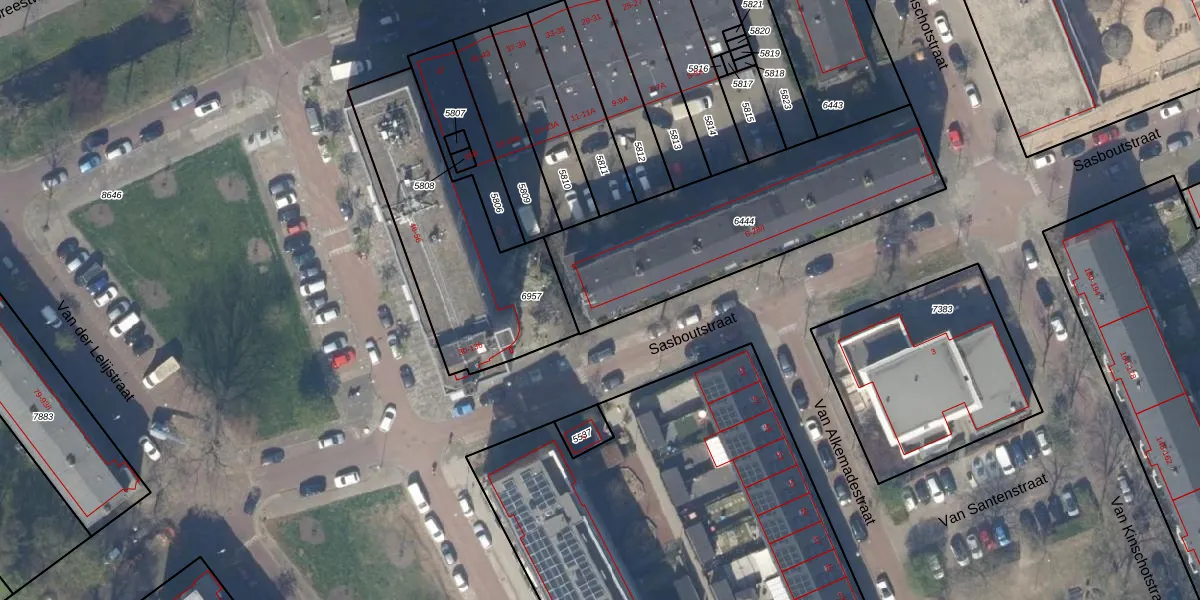 Sasboutstraat 28 is gelegen op kadastraal perceel DEL00F6444. Deze kadastrale aanduiding is uniek en wordt gebruikt door het Kadaster om eigendomsrechten en andere zakelijke rechten vast te leggen. Het perceel maakt onderdeel uit van de kadastrale gemeente Delft.