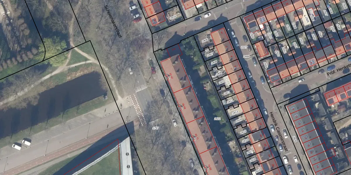 Het perceel waarop Schoemakerstraat 43 staat heeft een oppervlakte van 2582 m². Dit is een zeer groot perceel. De perceeloppervlakte wordt geregistreerd door het Kadaster. Gedetailleerde informatie over de maten van dit perceel kunt u vinden in het rapport Kadastrale kaart met maatvoering van Schoemakerstraat 43.