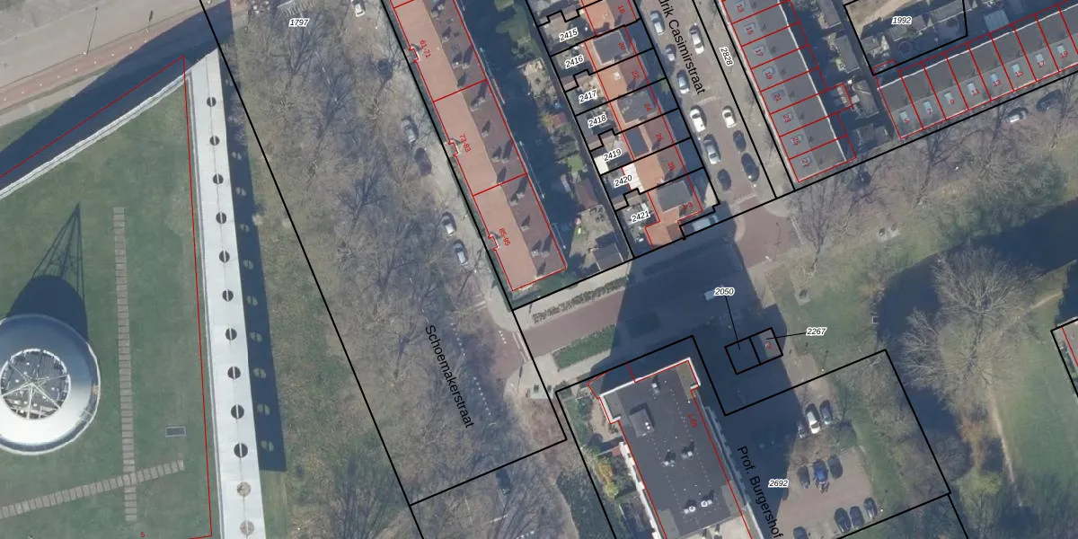 Het perceel waarop Schoemakerstraat 95 staat heeft een oppervlakte van 2582 m². Dit is een zeer groot perceel. De perceeloppervlakte wordt geregistreerd door het Kadaster. Gedetailleerde informatie over de maten van dit perceel kunt u vinden in het rapport Kadastrale kaart met maatvoering van Schoemakerstraat 95.