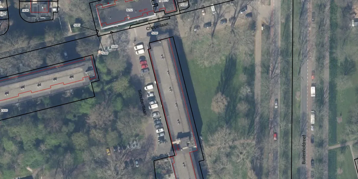 Het perceel waarop Schubertlaan 122-A staat heeft een oppervlakte van 3445 m². Dit is een zeer groot perceel. De perceeloppervlakte wordt geregistreerd door het Kadaster. Gedetailleerde informatie over de maten van dit perceel kunt u vinden in het rapport Kadastrale kaart met maatvoering van Schubertlaan 122-A.