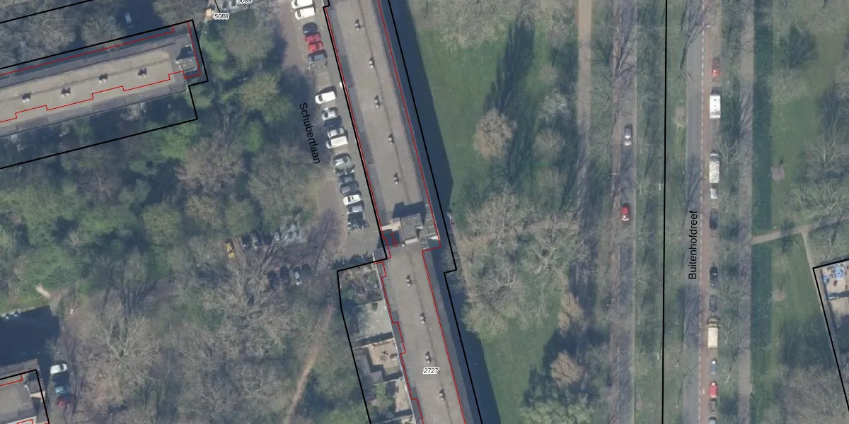 Het perceel waarop Schubertlaan 148-A staat heeft een oppervlakte van 3445 m². Dit is een zeer groot perceel. De perceeloppervlakte wordt geregistreerd door het Kadaster. Gedetailleerde informatie over de maten van dit perceel kunt u vinden in het rapport Kadastrale kaart met maatvoering van Schubertlaan 148-A.