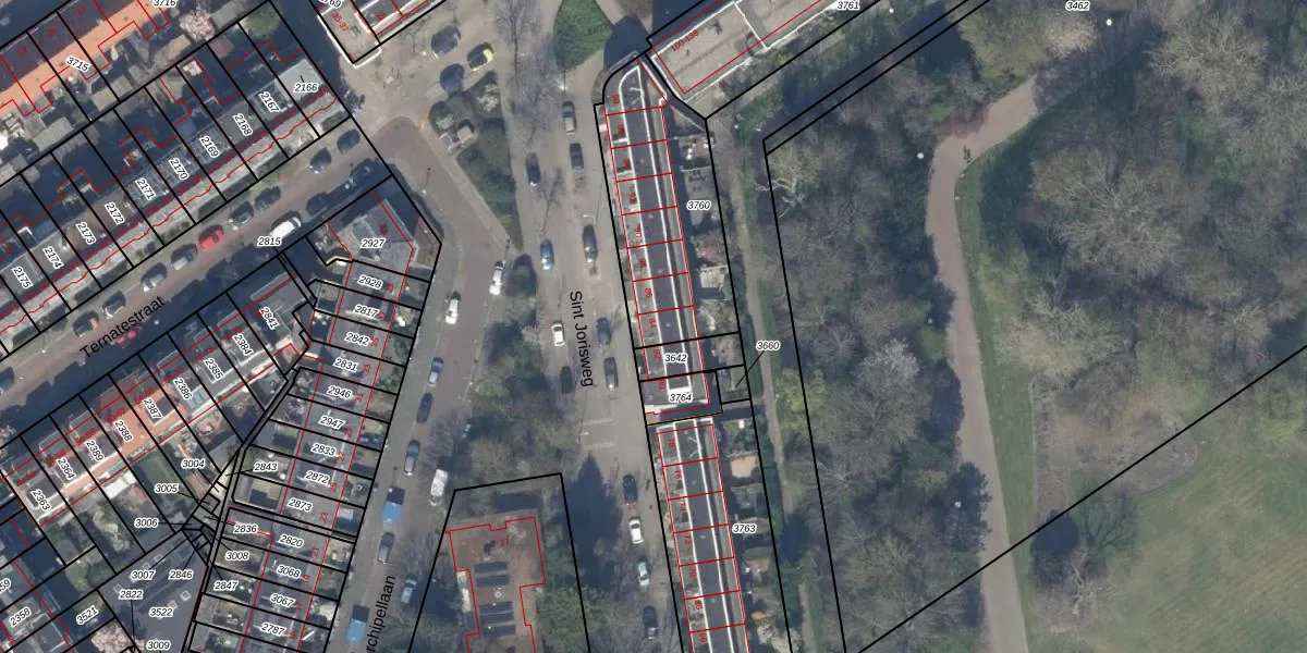 Het perceel waarop Sint Jorisweg 84 staat heeft een oppervlakte van 643 m². Dit is een groot perceel. De perceeloppervlakte wordt geregistreerd door het Kadaster. Gedetailleerde informatie over de maten van dit perceel kunt u vinden in het rapport Kadastrale kaart met maatvoering van Sint Jorisweg 84.