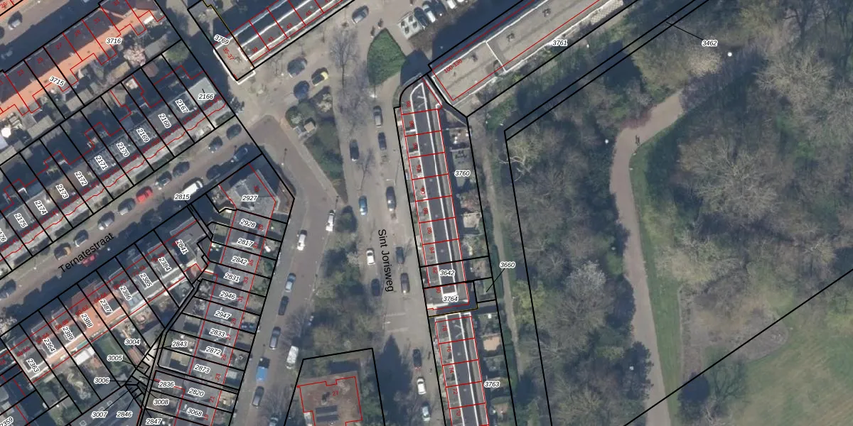 Het perceel waarop Sint Jorisweg 88 staat heeft een oppervlakte van 643 m². Dit is een groot perceel. De perceeloppervlakte wordt geregistreerd door het Kadaster. Gedetailleerde informatie over de maten van dit perceel kunt u vinden in het rapport Kadastrale kaart met maatvoering van Sint Jorisweg 88.