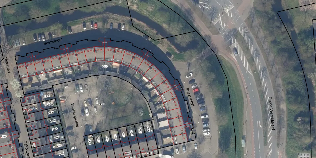 Het perceel waarop Suezsingel 27 staat heeft een oppervlakte van 3202 m². Dit is een zeer groot perceel. De perceeloppervlakte wordt geregistreerd door het Kadaster. Gedetailleerde informatie over de maten van dit perceel kunt u vinden in het rapport Kadastrale kaart met maatvoering van Suezsingel 27.
