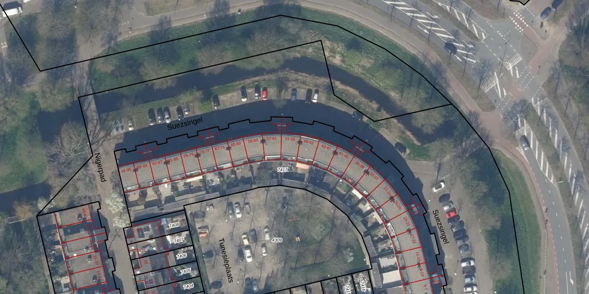 Suezsingel 55 is gelegen op kadastraal perceel DEL00R7417. Deze kadastrale aanduiding is uniek en wordt gebruikt door het Kadaster om eigendomsrechten en andere zakelijke rechten vast te leggen. Het perceel maakt onderdeel uit van de kadastrale gemeente Delft.