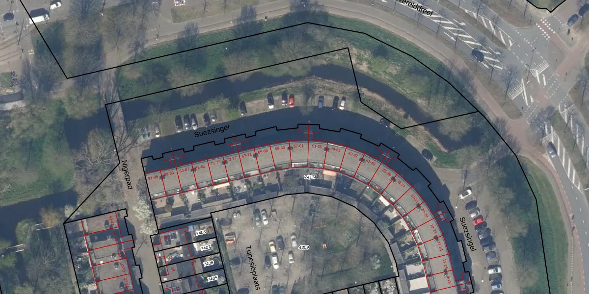 Suezsingel 61 is gelegen op kadastraal perceel DEL00R7417. Deze kadastrale aanduiding is uniek en wordt gebruikt door het Kadaster om eigendomsrechten en andere zakelijke rechten vast te leggen. Het perceel maakt onderdeel uit van de kadastrale gemeente Delft.