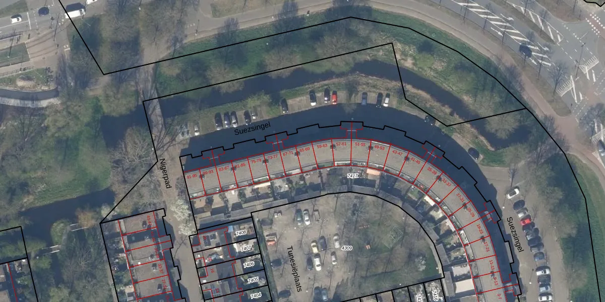 Het perceel waarop Suezsingel 65 staat heeft een oppervlakte van 3202 m². Dit is een zeer groot perceel. De perceeloppervlakte wordt geregistreerd door het Kadaster. Gedetailleerde informatie over de maten van dit perceel kunt u vinden in het rapport Kadastrale kaart met maatvoering van Suezsingel 65.