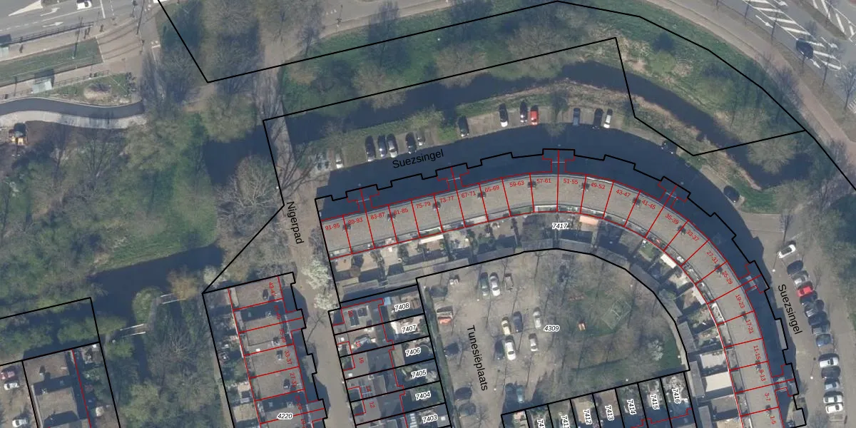 Het perceel waarop Suezsingel 75 staat heeft een oppervlakte van 3202 m². Dit is een zeer groot perceel. De perceeloppervlakte wordt geregistreerd door het Kadaster. Gedetailleerde informatie over de maten van dit perceel kunt u vinden in het rapport Kadastrale kaart met maatvoering van Suezsingel 75.