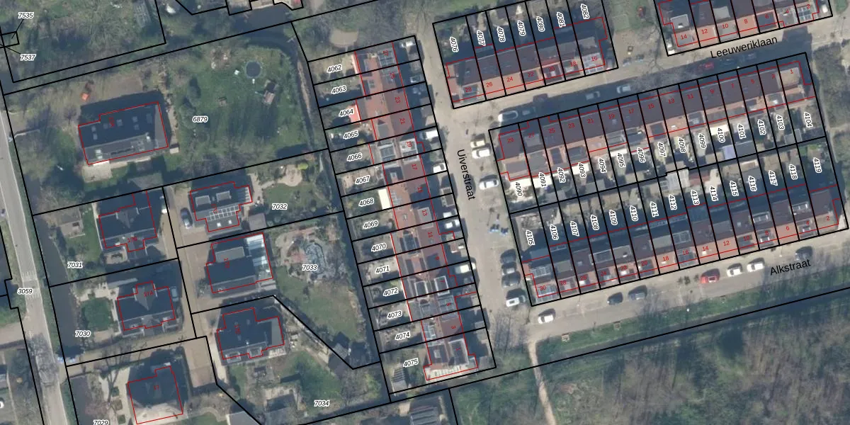 Uiverstraat 13 is gelegen op kadastraal perceel DEL00R4069. Deze kadastrale aanduiding is uniek en wordt gebruikt door het Kadaster om eigendomsrechten en andere zakelijke rechten vast te leggen. Het perceel maakt onderdeel uit van de kadastrale gemeente Delft.