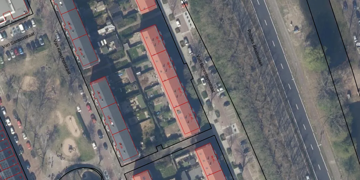 Het perceel waarop Van Beresteynstraat 55 staat heeft een oppervlakte van 6780 m². Dit is een zeer groot perceel. De perceeloppervlakte wordt geregistreerd door het Kadaster. Gedetailleerde informatie over de maten van dit perceel kunt u vinden in het rapport Kadastrale kaart met maatvoering van Van Beresteynstraat 55.