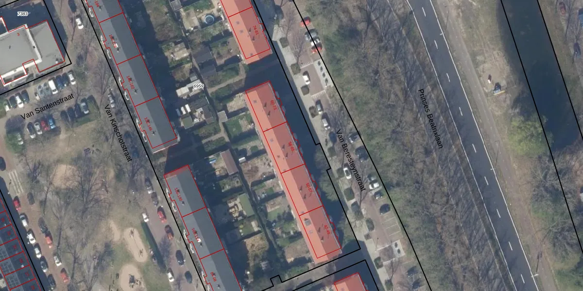 Het perceel waarop Van Beresteynstraat 65 staat heeft een oppervlakte van 6780 m². Dit is een zeer groot perceel. De perceeloppervlakte wordt geregistreerd door het Kadaster. Gedetailleerde informatie over de maten van dit perceel kunt u vinden in het rapport Kadastrale kaart met maatvoering van Van Beresteynstraat 65.