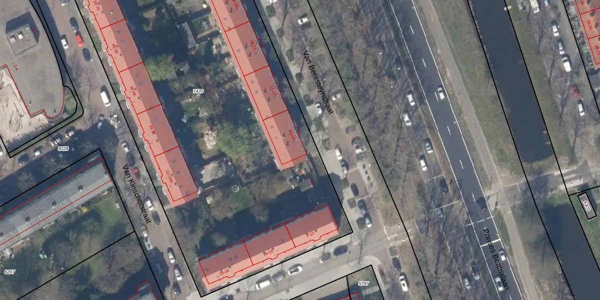 Het perceel waarop Van Beresteynstraat 9 staat heeft een oppervlakte van 7101 m². Dit is een zeer groot perceel. De perceeloppervlakte wordt geregistreerd door het Kadaster. Gedetailleerde informatie over de maten van dit perceel kunt u vinden in het rapport Kadastrale kaart met maatvoering van Van Beresteynstraat 9.