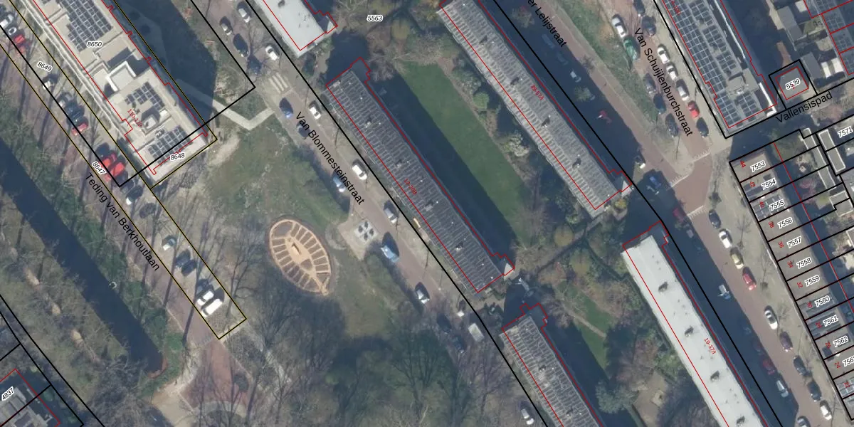 Het perceel waarop Van Blommesteinstraat 14-B staat heeft een oppervlakte van 9755 m². Dit is een zeer groot perceel. De perceeloppervlakte wordt geregistreerd door het Kadaster. Gedetailleerde informatie over de maten van dit perceel kunt u vinden in het rapport Kadastrale kaart met maatvoering van Van Blommesteinstraat 14-B.