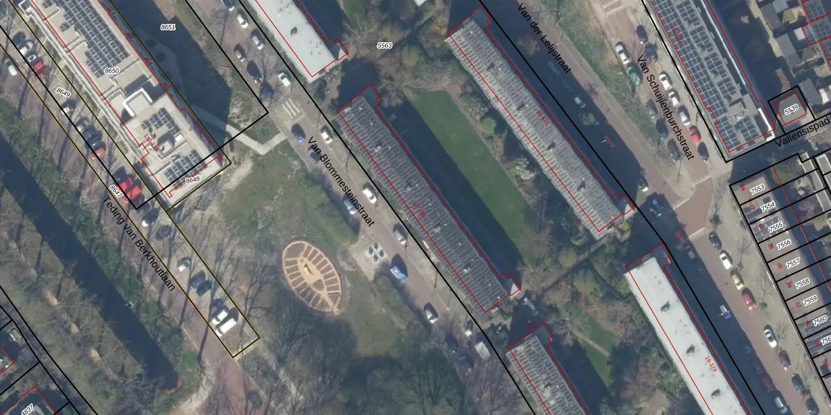 Het perceel waarop Van Blommesteinstraat 16-A staat heeft een oppervlakte van 9755 m². Dit is een zeer groot perceel. De perceeloppervlakte wordt geregistreerd door het Kadaster. Gedetailleerde informatie over de maten van dit perceel kunt u vinden in het rapport Kadastrale kaart met maatvoering van Van Blommesteinstraat 16-A.