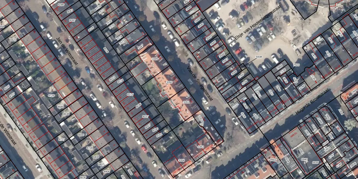 Van de Spiegelstraat 13 is gelegen op kadastraal perceel DEL00F3350. Deze kadastrale aanduiding is uniek en wordt gebruikt door het Kadaster om eigendomsrechten en andere zakelijke rechten vast te leggen. Het perceel maakt onderdeel uit van de kadastrale gemeente Delft.