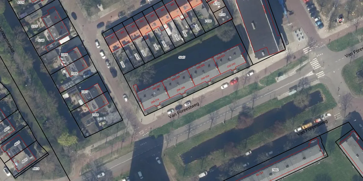 Het perceel waarop Van Foreestweg 260 staat heeft een oppervlakte van 1776 m². Dit is een zeer groot perceel. De perceeloppervlakte wordt geregistreerd door het Kadaster. Gedetailleerde informatie over de maten van dit perceel kunt u vinden in het rapport Kadastrale kaart met maatvoering van Van Foreestweg 260.