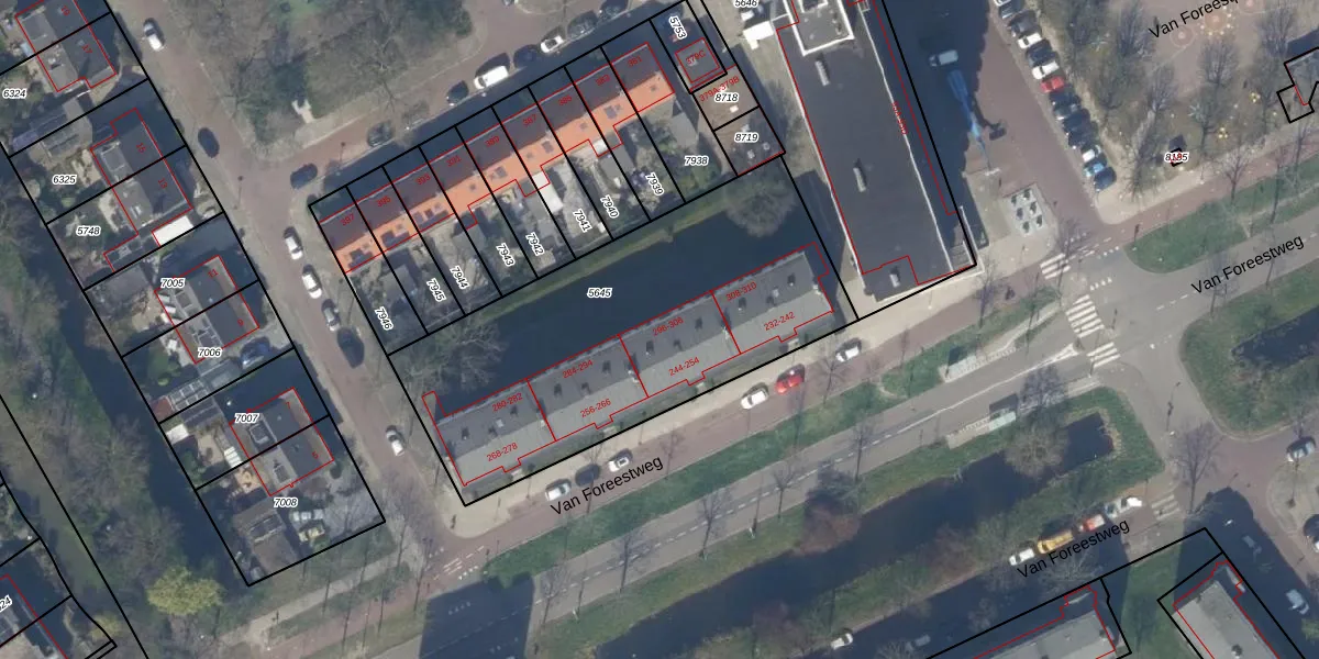 Het perceel waarop Van Foreestweg 300 staat heeft een oppervlakte van 1776 m². Dit is een zeer groot perceel. De perceeloppervlakte wordt geregistreerd door het Kadaster. Gedetailleerde informatie over de maten van dit perceel kunt u vinden in het rapport Kadastrale kaart met maatvoering van Van Foreestweg 300.