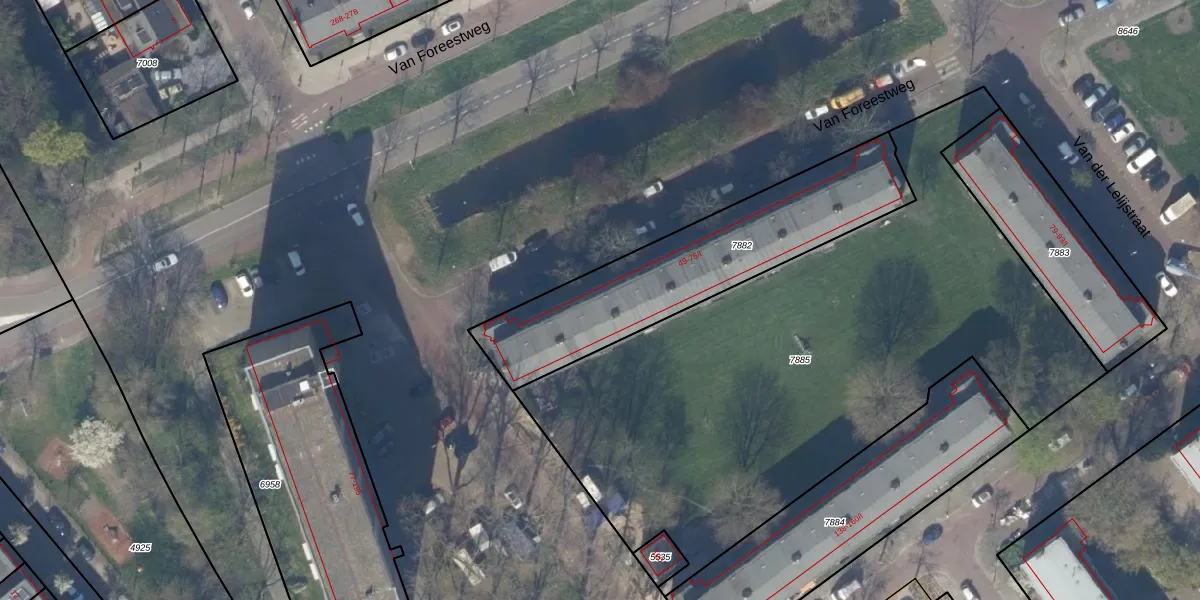 Het perceel waarop Van Foreestweg 69 staat heeft een oppervlakte van 935 m². Dit is een groot perceel. De perceeloppervlakte wordt geregistreerd door het Kadaster. Gedetailleerde informatie over de maten van dit perceel kunt u vinden in het rapport Kadastrale kaart met maatvoering van Van Foreestweg 69.