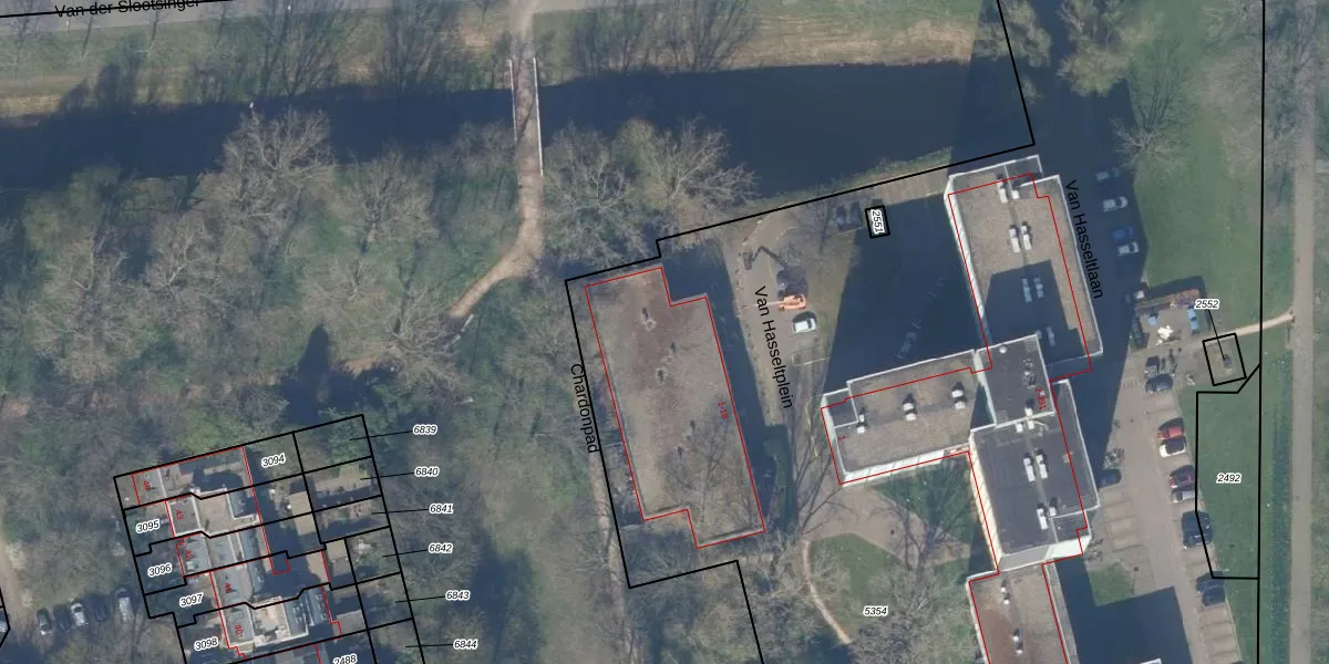 Het perceel waarop Van Hasseltplein 12 staat heeft een oppervlakte van 1,5 ha. Dit is een zeer groot perceel. De perceeloppervlakte wordt geregistreerd door het Kadaster. Gedetailleerde informatie over de maten van dit perceel kunt u vinden in het rapport Kadastrale kaart met maatvoering van Van Hasseltplein 12.