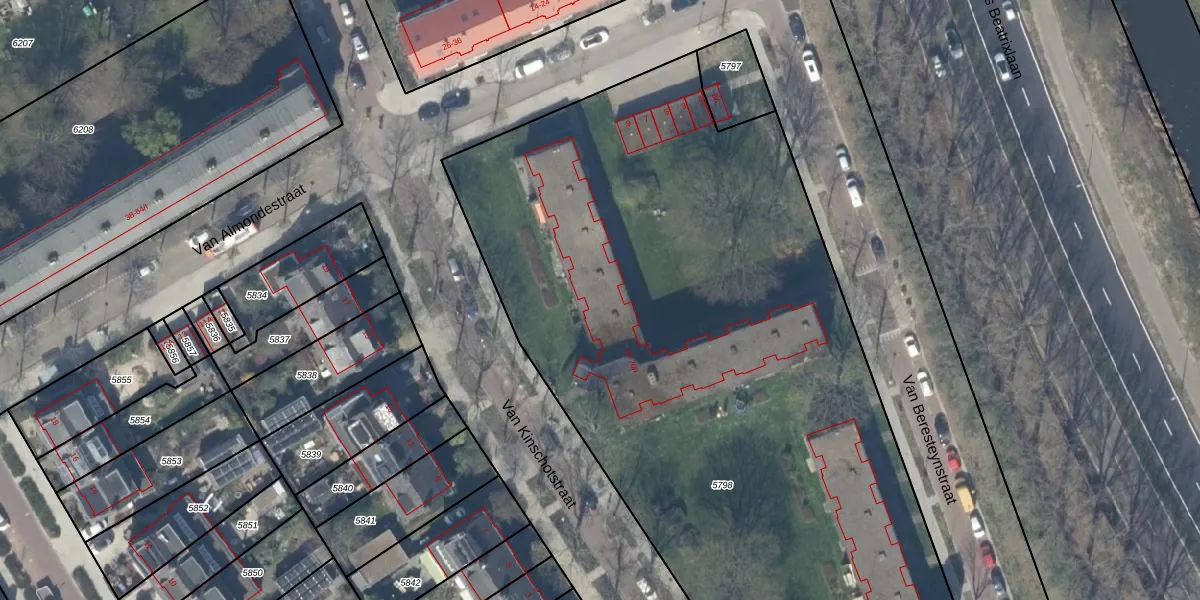 Het perceel waarop Van Kinschotstraat 14-I staat heeft een oppervlakte van 5338 m². Dit is een zeer groot perceel. De perceeloppervlakte wordt geregistreerd door het Kadaster. Gedetailleerde informatie over de maten van dit perceel kunt u vinden in het rapport Kadastrale kaart met maatvoering van Van Kinschotstraat 14-I.