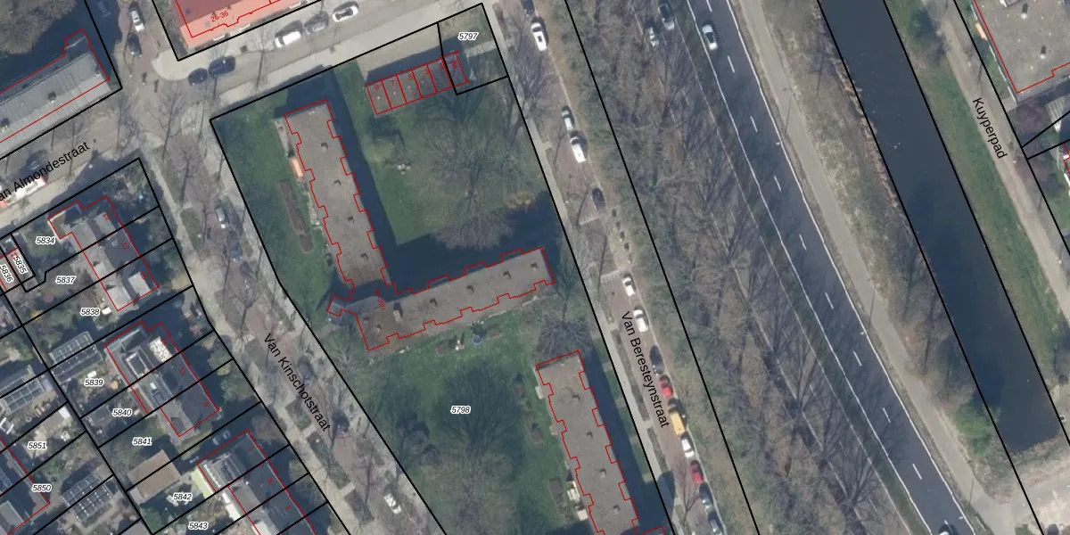 Het perceel waarop Van Kinschotstraat 2-A-I staat heeft een oppervlakte van 5338 m². Dit is een zeer groot perceel. De perceeloppervlakte wordt geregistreerd door het Kadaster. Gedetailleerde informatie over de maten van dit perceel kunt u vinden in het rapport Kadastrale kaart met maatvoering van Van Kinschotstraat 2-A-I.