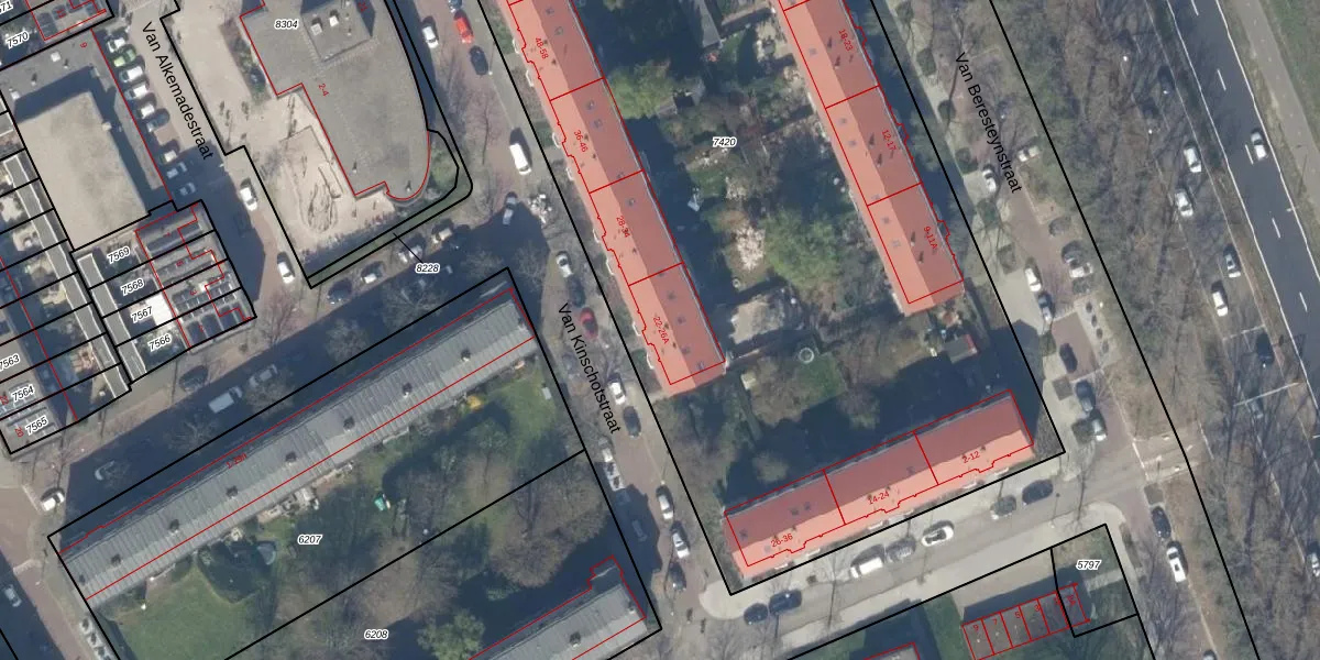 Het perceel waarop Van Kinschotstraat 22-A staat heeft een oppervlakte van 7101 m². Dit is een zeer groot perceel. De perceeloppervlakte wordt geregistreerd door het Kadaster. Gedetailleerde informatie over de maten van dit perceel kunt u vinden in het rapport Kadastrale kaart met maatvoering van Van Kinschotstraat 22-A.