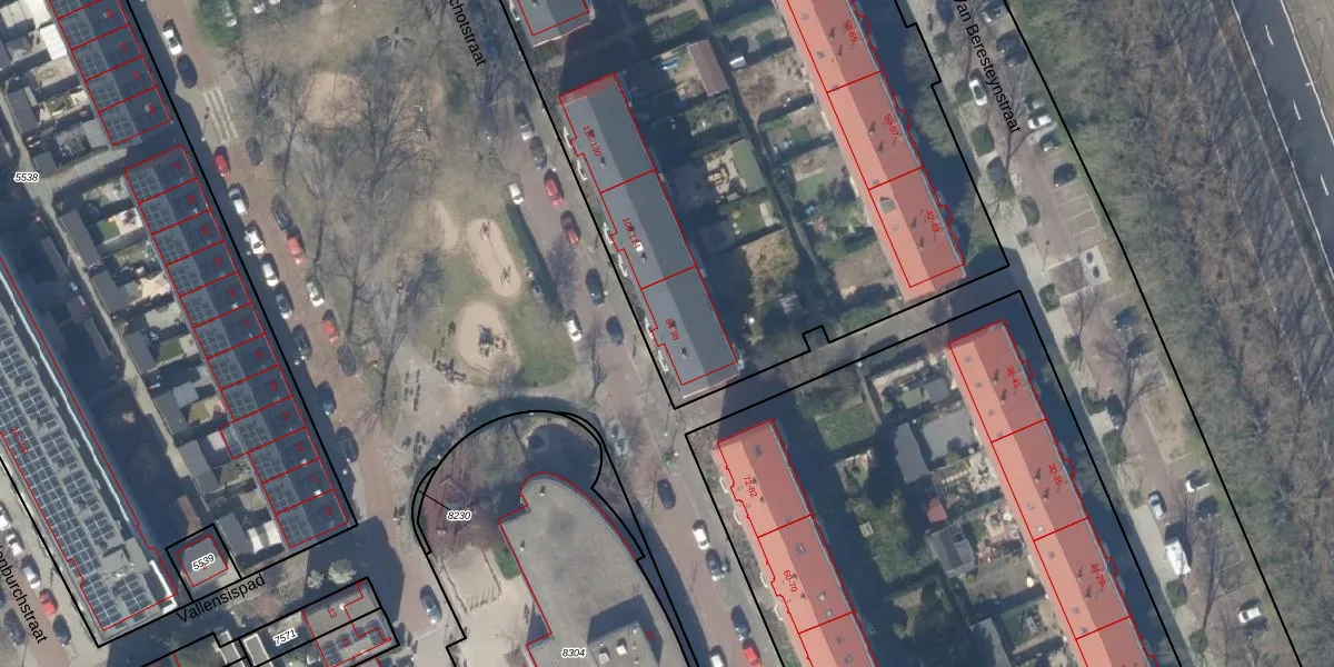 Het perceel waarop Van Kinschotstraat 92 staat heeft een oppervlakte van 6780 m². Dit is een zeer groot perceel. De perceeloppervlakte wordt geregistreerd door het Kadaster. Gedetailleerde informatie over de maten van dit perceel kunt u vinden in het rapport Kadastrale kaart met maatvoering van Van Kinschotstraat 92.