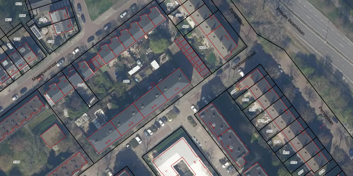 Het perceel waarop Vosmaerstraat 10 staat heeft een oppervlakte van 4290 m². Dit is een zeer groot perceel. De perceeloppervlakte wordt geregistreerd door het Kadaster. Gedetailleerde informatie over de maten van dit perceel kunt u vinden in het rapport Kadastrale kaart met maatvoering van Vosmaerstraat 10.