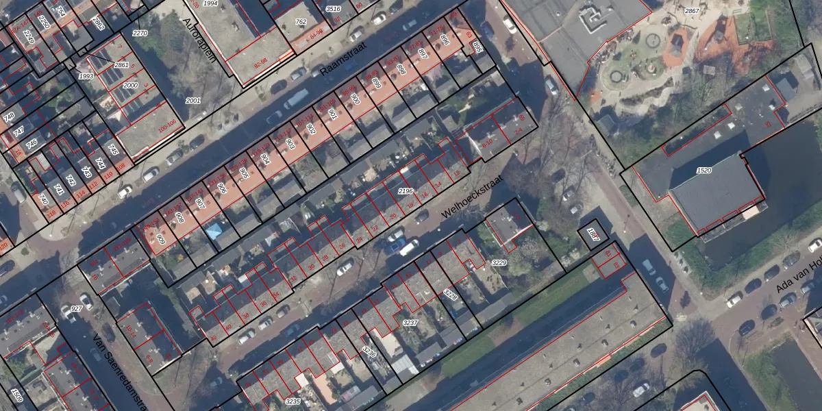 Het perceel waarop het adres ligt is DEL00-O-2196. De afkorting 'DEL00' staat voor kadastrale gemeente Delft. Het perceel is met 2235 m² relatief groot. Het gemiddelde ligt in de kadastrale gemeente Delft op 923,41 m². De grootste perceeloppervlakte in de kadastrale gemeente is 64,1 ha. De kleinste oppervlakte bedraagt 0 m². Er zijn 33 adressen aanwezig op het perceel. De huidige grenzen van het perceel zijn digitaal in de Basisregistratie Kadaster (BRK) geregistreerd op 09-10-2006.