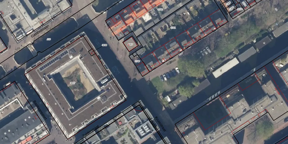 Het perceel waarop Zuiderstraat 222 staat heeft een oppervlakte van 88 m². Dit is een klein perceel. De perceeloppervlakte wordt geregistreerd door het Kadaster. Gedetailleerde informatie over de maten van dit perceel kunt u vinden in het rapport Kadastrale kaart met maatvoering van Zuiderstraat 222.