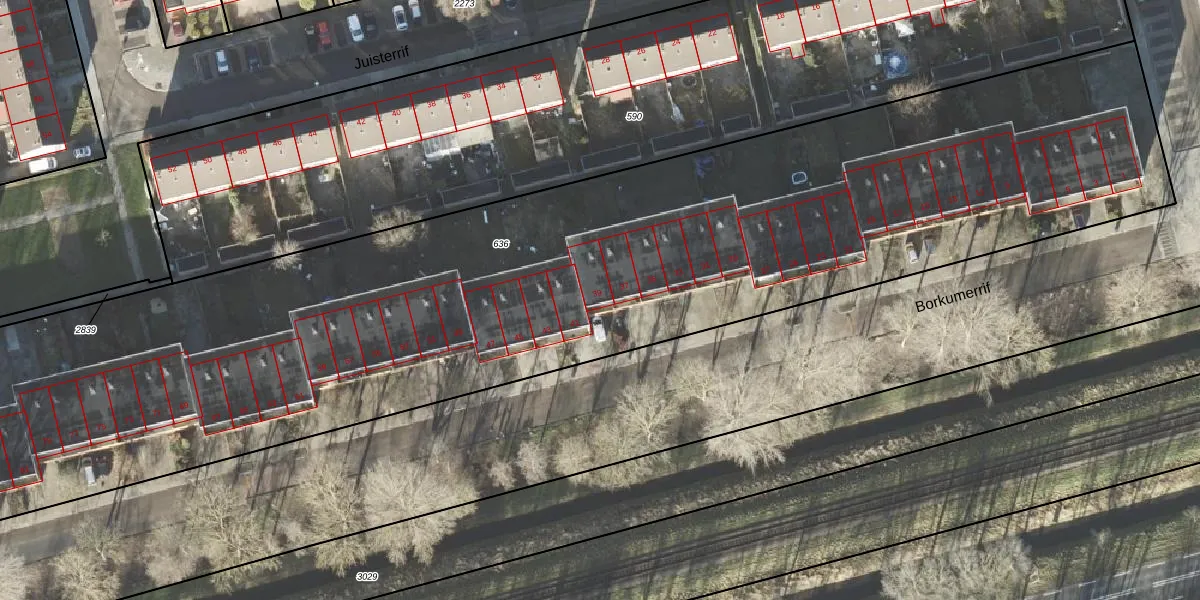 Het perceel waarop Borkumerrif 39 staat heeft een oppervlakte van 6524 m². Dit is een zeer groot perceel. De perceeloppervlakte wordt geregistreerd door het Kadaster. Gedetailleerde informatie over de maten van dit perceel kunt u vinden in het rapport Kadastrale kaart met maatvoering van Borkumerrif 39.