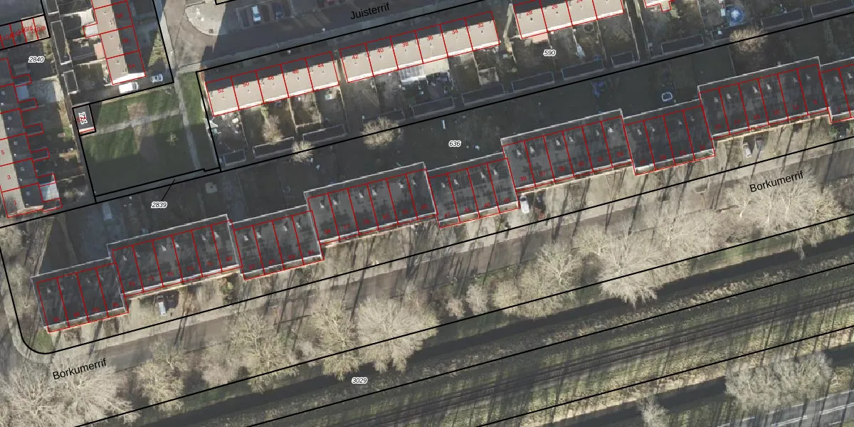 Het perceel waarop Borkumerrif 49 staat heeft een oppervlakte van 6524 m². Dit is een zeer groot perceel. De perceeloppervlakte wordt geregistreerd door het Kadaster. Gedetailleerde informatie over de maten van dit perceel kunt u vinden in het rapport Kadastrale kaart met maatvoering van Borkumerrif 49.
