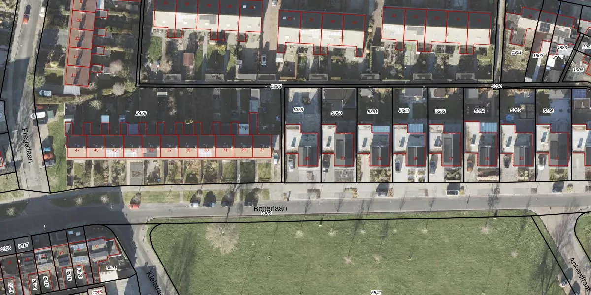 Het perceel waarop Botterlaan 25 staat heeft een oppervlakte van 399 m². Dit is een groot perceel. De perceeloppervlakte wordt geregistreerd door het Kadaster. Gedetailleerde informatie over de maten van dit perceel kunt u vinden in het rapport Kadastrale kaart met maatvoering van Botterlaan 25.
