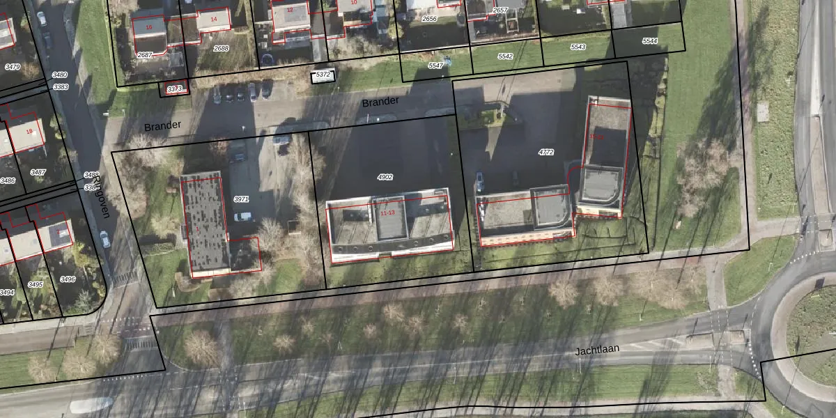 Het perceel waarop Brander 13 staat heeft een oppervlakte van 1350 m². Dit is een zeer groot perceel. De perceeloppervlakte wordt geregistreerd door het Kadaster. Gedetailleerde informatie over de maten van dit perceel kunt u vinden in het rapport Kadastrale kaart met maatvoering van Brander 13.