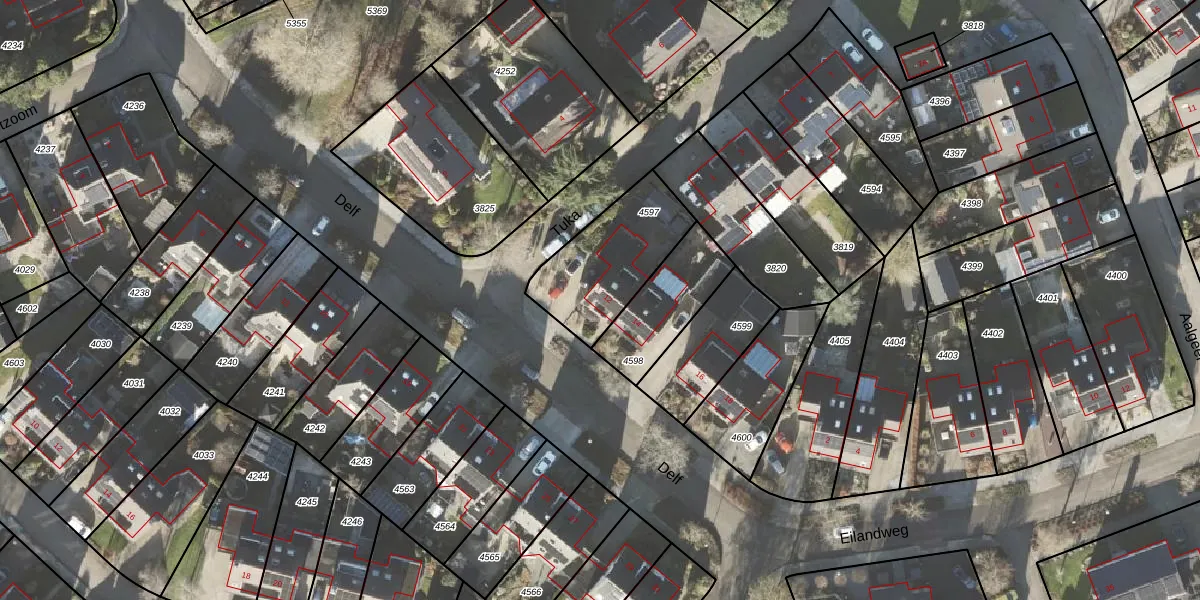 Het perceel waarop Delf 12 staat heeft een oppervlakte van 387 m². Dit is een groot perceel. De perceeloppervlakte wordt geregistreerd door het Kadaster. Gedetailleerde informatie over de maten van dit perceel kunt u vinden in het rapport Kadastrale kaart met maatvoering van Delf 12.